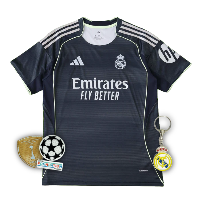 The Real Madrid Away 25/26 Shirt - Men's Black Fan Shirt is perfect for those who live their passion for football on a daily basis. Made with lightweight, breathable fabric, it offers comfort throughout use, whether in games, outings or in your routine. With a design faithful to the official model, it is ideal for fans looking for style, club identity and quality in the finish. An essential piece for those who collect or wear the jersey with pride.
